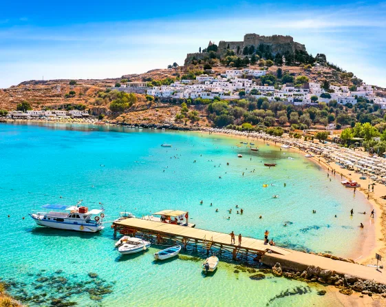 Линдос – две живописные бухты, раскинутые у подножия скалы. Расположен на Средиземном море.